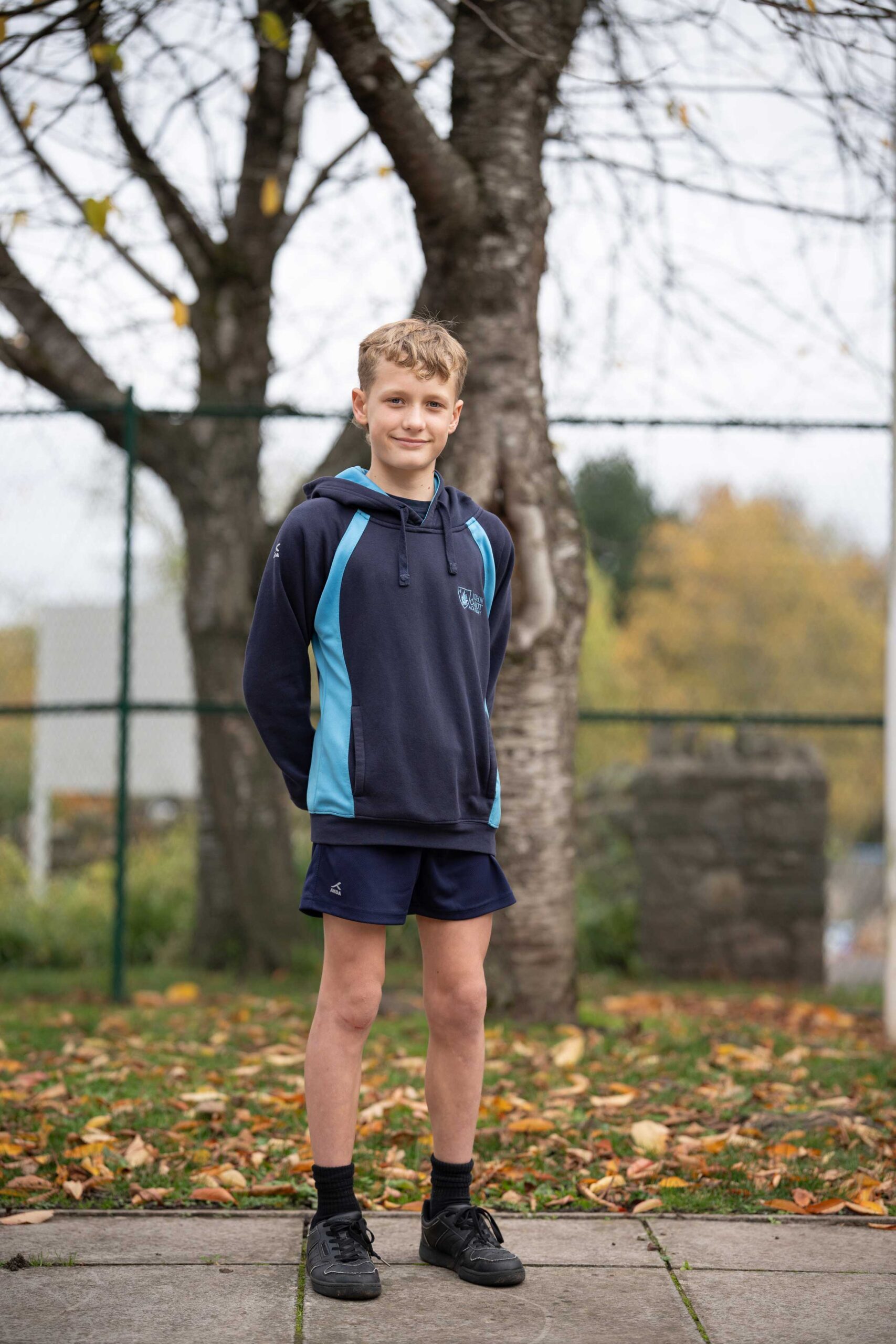 Jumper* or Hoodie* Jumper – Dark blue, v-neck, with blue piping at the neck.
