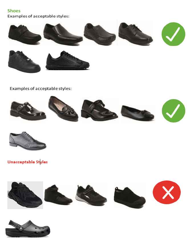 Shoes must be plain black and can have laces, a buckle, be slip-on or have a velcro strap; a brief sample of acceptable shoe styles is shown here.  Trainers, sport shoes, plimsolls, daps or pumps are not acceptable, neither are boots nor shoes with high heels.