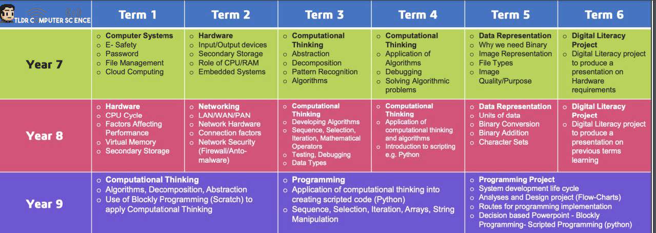 We deliver a computing curriculum with elements of computer science, digital literacy and information technology. The curriculum is sequenced so that key knowledge is introduced in year 7, allowing these strands to be revisited and built upon in the consecutive years. This interleaving is in place to allow students to develop robust schema to conceptualise the abstract learning inherent in the curriculum. The chief thinking skills we’re striving to develop in our students are computational thinking skills around decomposition, abstraction and algorithmic thinking.