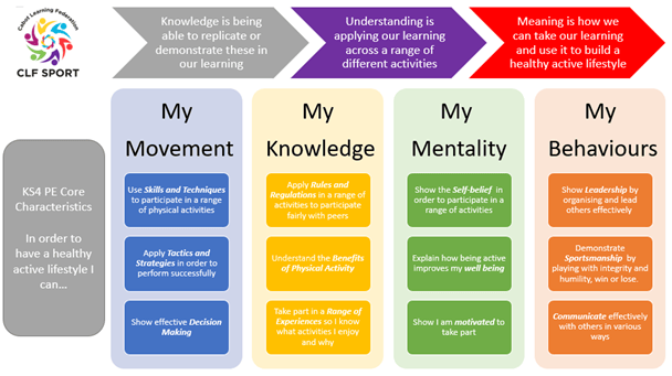 - In KS4 Core PE students will further develop their physical literacy via a range of recreational activities with a view to engraining positive behaviours that promote the benefits of physical activity and prepare them for activity across their life course. There is no formal assessment of KS4 core PE.